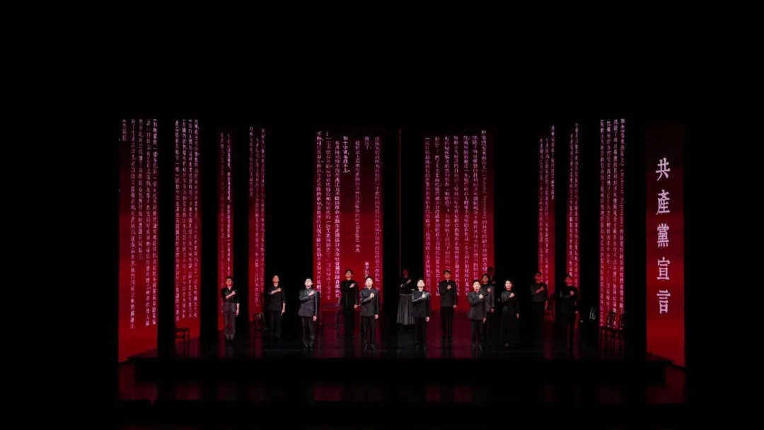 话剧《红色的起点》有着新锐鲜明的戏剧风格。舞美设计不追求还原实景,而是以桌椅分割舞台空间,将极简风格的写意式设计体现得淋漓尽致。十几块多媒体电子屏环构成舞台上重要的视觉元素,时而展现历史图景,时而烘托戏剧情感,为观众带来新颖的视觉体验。泛黄的视觉资料宛如久远的历史记忆,行动中的演员们也像是在历史中穿梭。直角线条的舞台元素寓意着革命者坚定的信念感,红色与黑色为主色调的舞台代表着在黑暗的环境中,党用红色初心开辟出的光明之路。