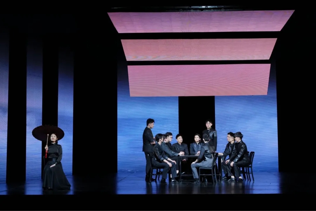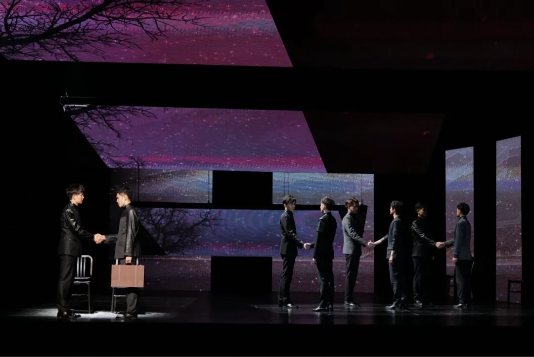 大幕拉开,几根白色的长几何光柱将舞台背景分割,宛如在漆黑的夜里出现的几道光,从缝隙中透过,来到观众眼前。锐利的线条,对比鲜明的色调,奠定了整部作品的审美基调。观众们凝视着舞台,被这种凝练的戏剧开场所吸引。