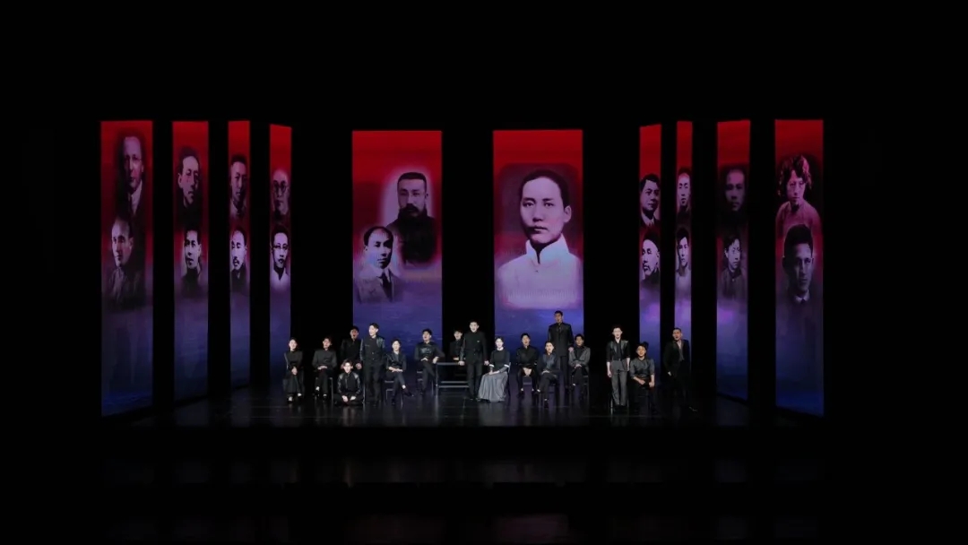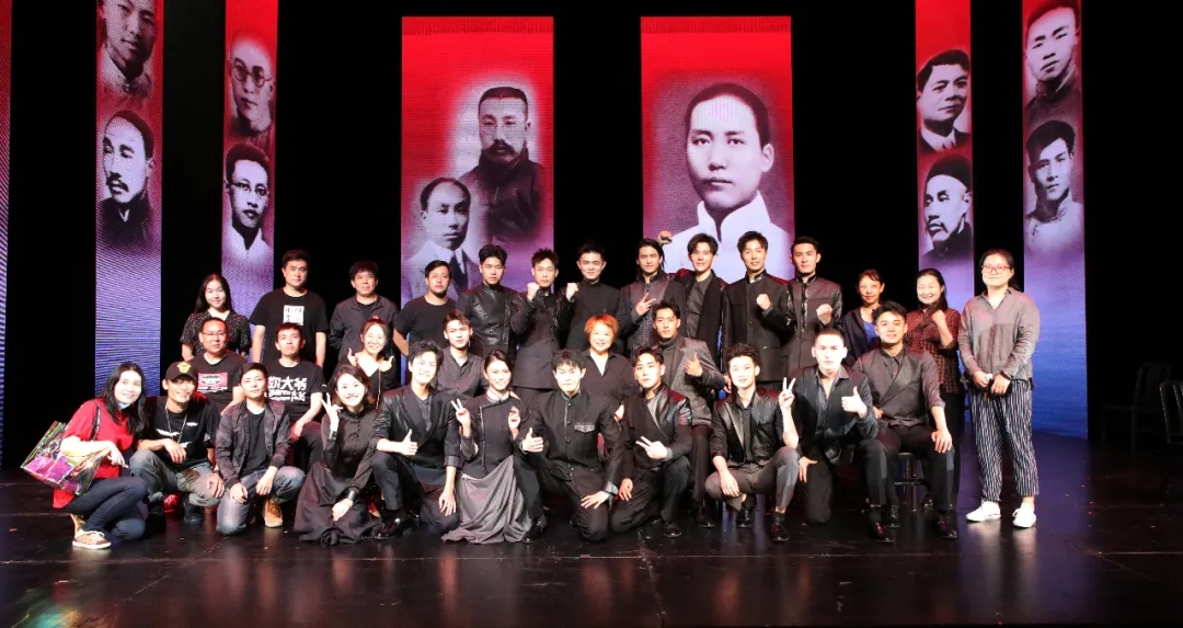 在作品结尾部分,演员们错落地站着或坐在舞台上,齐声高唱:“我们的模样,映照在梦想的墙上,从天真浪漫的最初,到拥抱一切的远方。”观众们也情不自禁随着音乐拍起节奏,重温这开天辟地的重要历史时刻。这些年轻的演员们,在剧中不仅仅代表着角色故事中的一个或某个人物,更是代表了当时不愿意受压迫、不愿受欺负的中国人,代表了那一批有热血干劲、励志要救国的一群人,而在结尾的时刻,他们从似乎又成为了他们自己,成为了舞台上这一群平均年龄不超过二十五岁的、刚刚毕业的大学生,成为了向革命前辈学习、致敬的新时代青年。同一个舞台,不同的时代,却是一样的青春,一样的朝气蓬勃,充满理想。