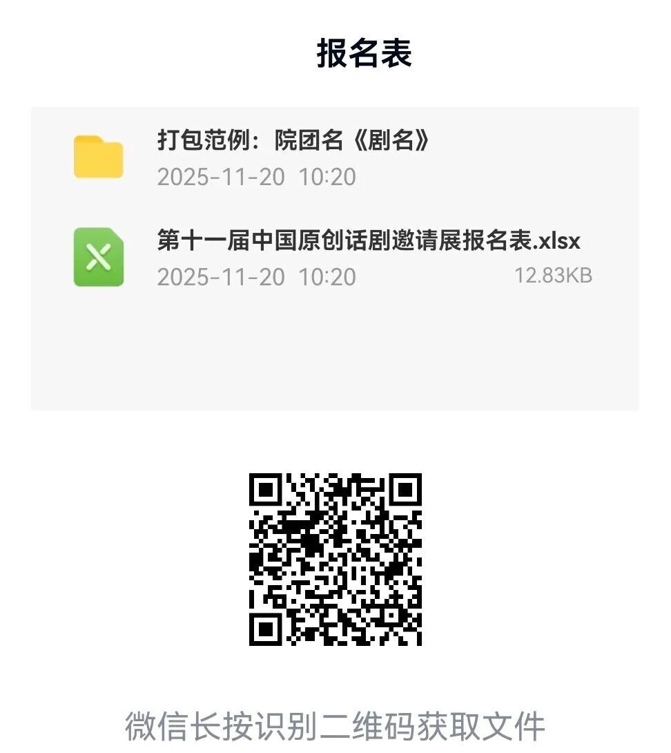 ·请关注“国家话剧院剧场”官方微信公众号,在对话框内回复关键词“报名”,系统将自动回复《第十一届中国原创话剧邀请展报名表》网盘下载链接。