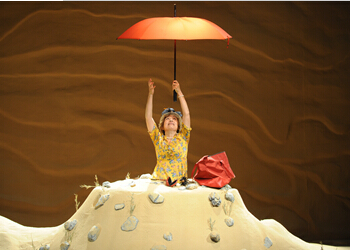 故事发生在一个前无古人后无来者的荒芜之地,主人翁温妮被沙土埋至腰身,她井井有条地借助她的生活必需品,牙刷,牙膏,眼镜,药品,伞,在一个无法行动的状态下乐观地安排着自己美好的日子,在她精神摇摆之时,她举起自己的手枪却选择快乐着继续下去。在这长日无尽的世界里,只有闹铃帮她来划清睡觉与苏醒的界限,与她厮守到最后的是与她无言以对的威力,在明灭灯吹之际,记忆中的华尔兹再次在二人耳边响起。