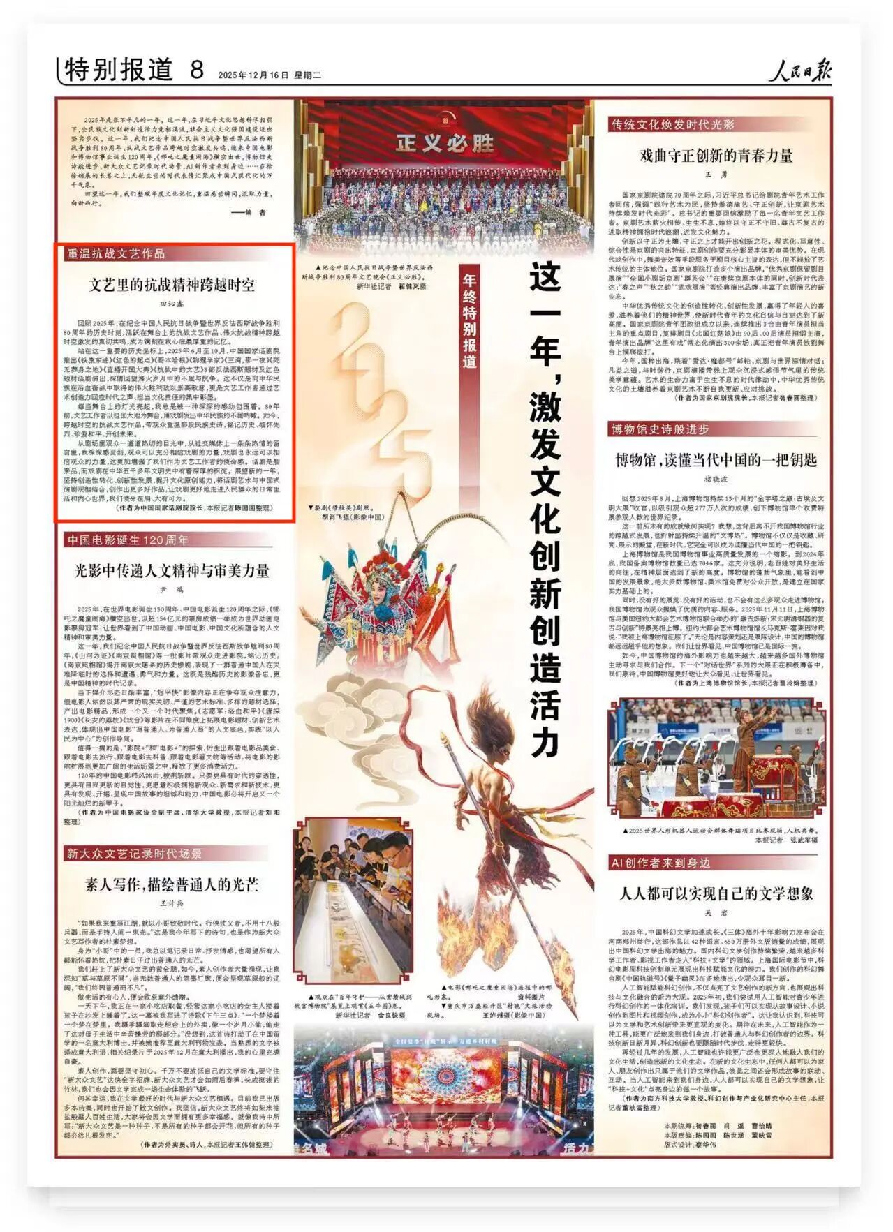 回顾2025年,在纪念中国人民抗日战争暨世界反法西斯战争胜利80周年的历史时刻,活跃在舞台上的抗战文艺作品、伟大抗战精神跨越时空激发的真切共鸣,成为镌刻在我心底最厚重的记忆。